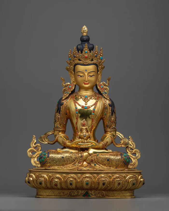 Aparmita is the name given to Amitabha in his character of bestower of longevity. Aparmita may be turned either a “Crowned Buddha or a Bodhisattva and is therefore richly clad and wears the thirteen ornaments. His hair is painted blue and falls on either side to his elbows or may be curiously coiled. Aparmita is seated like Buddha and his hands lie on his lap in Dhyana Mudra holding the ambrosia vase, his special emblem. The vase is richly decorated and from the cover fall four strings of beads which represent sacred pills. In the preliminary worship, the pills made from buttered dough and the ambrosia brewed from spirit or beer and offered in a skull bowl to the great image of Aparmita. The lama then places a vajra on the ambrosia vase, which the image of Amitayus holds in its lap, and applies a cord, which is attached to the vajra, his own heart. The wine in the ambrosia vase is then consecrated and the people partake of it as well as of the sacred pills with the firm conviction that there lives will be prolonged through their faith in Aparmita.